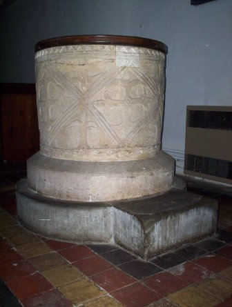 To the right of the south door is a 12th century (probably Norman) stone font. Opposite the south door is a blocked doorway which,